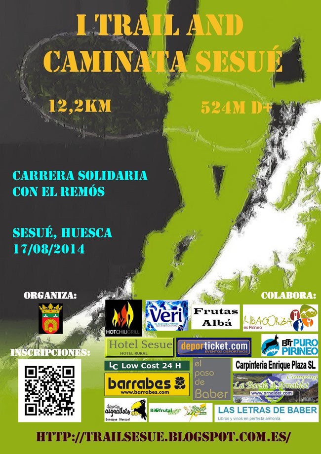 La carrera se celebrará el próximo 17 de agosto de 2014 a las 9:30h. El trail y caminta de Sesué es un recorrido circular de 12,2km y 524m de desnivel positivo acumulado que transcurre por las poblaciones de Sesué, Castejón de Sos, Sos y Eresué. El circuito os permitirá disfrutar de impresionantes miradores con vistas sobre la Sierra de Chía y el Valle de Benasque, en una zona frecuentemente transitada por avionetas y parapentes.