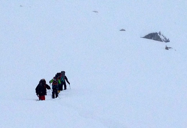 Ayer, tras 10 duras horas, consiguieron abrir huella con esquís y raquetas hasta el campo 1; hoy intentan alcanzar el campo 2.
