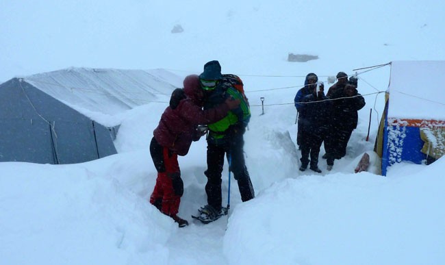 Pero una vez alcanzado el campo no ha finalizado el trabajo: ya en plena oscuridad, han tenido que excavar durante dos horas para encontrar su depósito, totalmente enterrado en la nieve, y poder instalar sus tiendas.