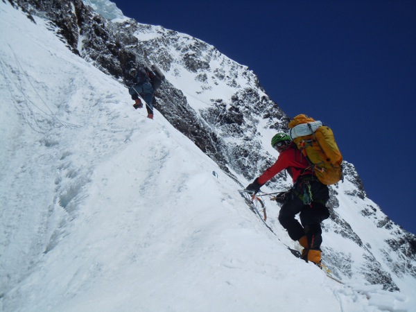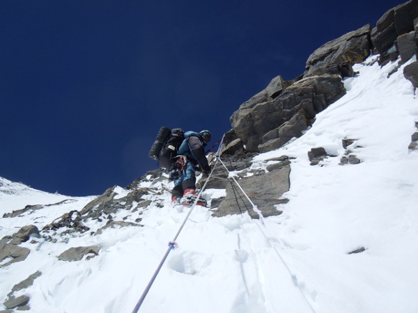 Alex abriendo la ruta a 7350m, entre viejas y rotas cuerdas de anteriores años