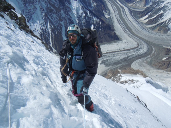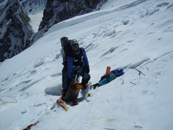 Alex a 7300m, con el glaciar Goldwin Austen detrás