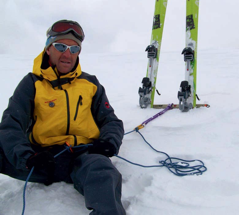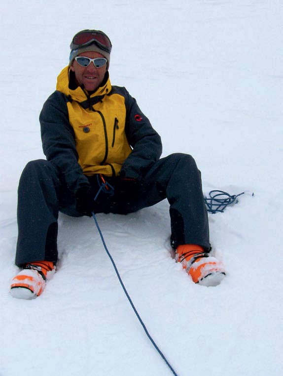 Un aseguramiento sencillo y rápido, para salir del paso, puede ser aquel de simplemente dejarnos caer sentados en la nieve. Tallar unos buenos peldaños para los pies y asegurar al arnés con un nudo dinámico. El nudo dinámico funciona bien con cuerdas mojadas e incluso heladas, de ahí la ventaja sobre plaquetas de freno. En la foto 12 aseguramos