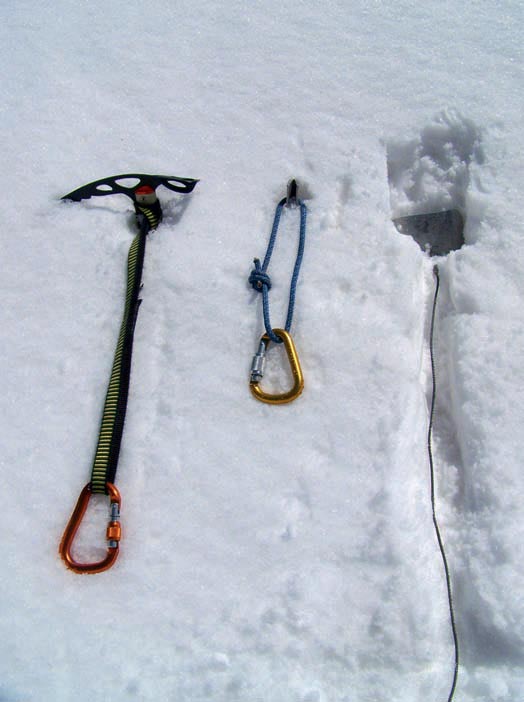 los mismos principios que el piolet pueden ser: botes de agua, estacas de nieve, mochilas, piedras, etc. En la foto 7 observamos también un bote de agua atado con una cinta y listo para ser enterrado en la trinchera. Un buen pisado de nieve es necesario para consolidar esa nieve y enterrar el bote o anclaje sólidamente en la nieve.