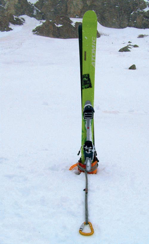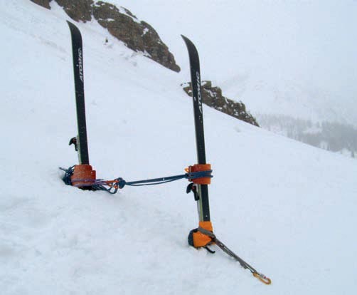 Esquís en forma de I: El anclaje de esquís en forma de I es no tan resistente como el anterior pero es práctico para asegurar cargas ligeras. Se clavan uno o los dos esquís en la nieve dura hasta la fijación, manteniendo, como hemos visto anteriormente , una línea perpendicular con respecto a la superficie de la nieve. A continuación atamos una cinta o cordino alrededor de los esquís y cerca de la superficie de la nieve. Con el fin de evitar que los cantos de los esquís puedan cortar o dañar la cinta o cordino del anclaje, colocaremos un sistema de protección entre la cinta y los esquís. Un guante o las pieles de foca pueden sacarnos del apuro. En la foto 4 observamos los esquís en forma de I.