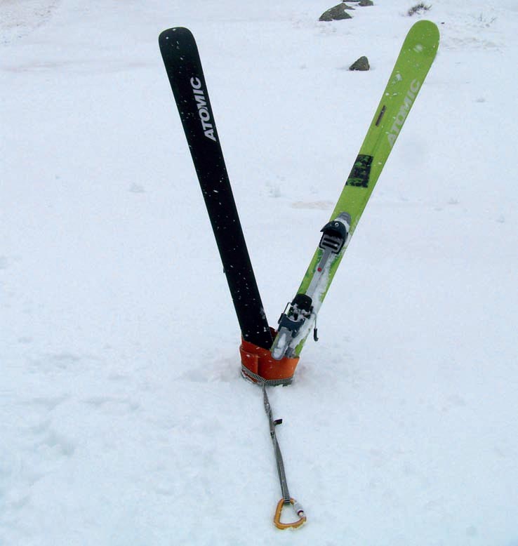 Esquís en forma de X: El anclaje formado por los esquís en forma de X crea su resistencia de acuerdo con una mayor superficie de actuación. Colocaremos un esquí en la nieve en diagonal con unos 15 grados de inclinación con respecto a la superficie. Hacemos lo mismo con el segundo esquí, cruzándose los dos en la base. Los dos esquís los introducimos hasta las fijaciones. Colocamos las pieles de foca o una funda alrededor de los esquís, justo en la base de contacto con la nieve. Finalmente atamos la cinta o cordino de reunión y la cual nos servirá de anclaje. En la foto 6 observamos un anclaje de esquís en forma de X.
