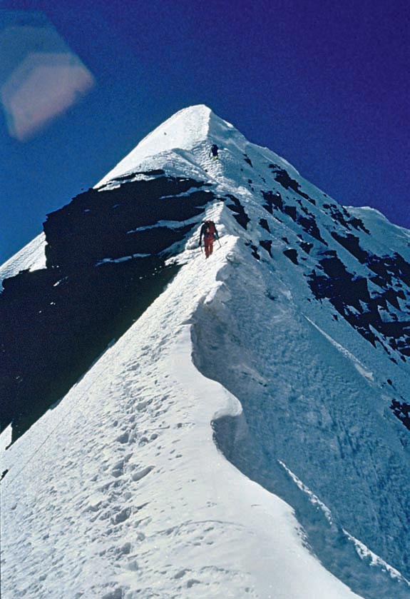 progresa por un lado y el otro escalador progresa por el otro. Si uno de ellos se cae el compañero podrá detenerlo simplemente con su peso, debido al efecto de contrapeso. La cuerda ha de estar tensa entre ambos. En la foto 11 observamos un arista de nieve.