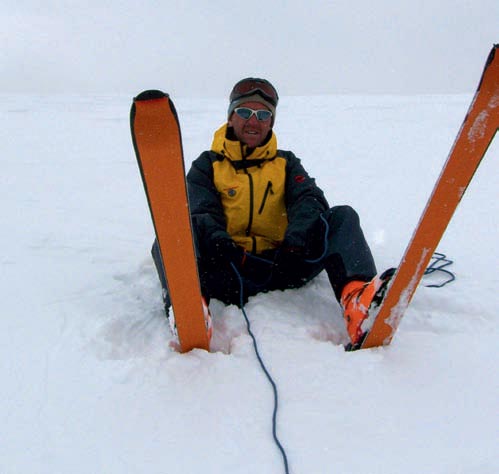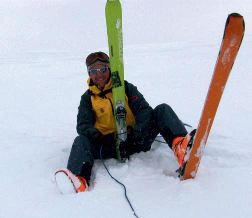 Si viajamos con los esquís podemos realizar la misma maniobra pero sin quitarnos los esquís. Simplemente nos sentaremos en la nieve y clavaremos los esquís en ella sin quitárnoslos. A continuación aseguraremos al arnés (foto 13). Una variante del ejemplo anterior consiste en quitarse un esquí y clavarlo delante de nuestro pecho, con el fin de conseguir una mayor retención. El otro esquí lo mantendremos en la bota y clavado en la nieve (foto 14).