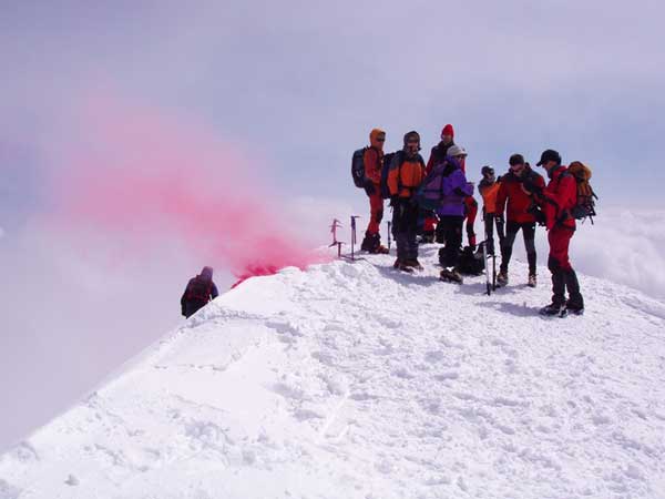 El grupo, en la cima mientras se eleva el humo de las bengalas