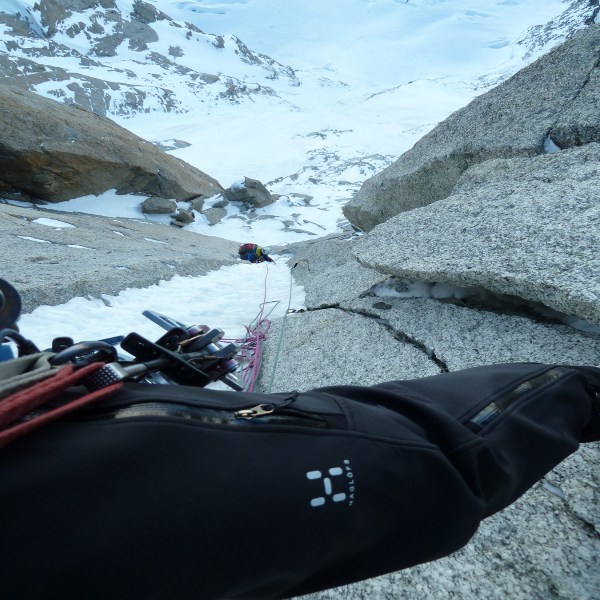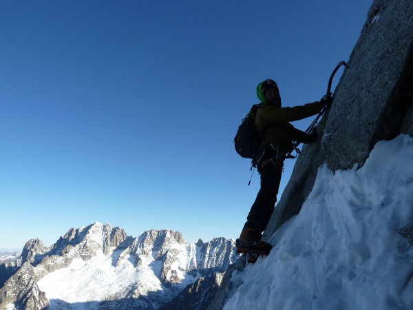 En seis largos de 60 metros con algún paso aislado de M5+, nos plantamos justo debajo del cable del teleférico. El primer largo y el del bloque empotrado son los más espectaculares, con movimientos muy estéticos sobre nuestros piolets. A partir de aquí consideramos que vamos a ir más rápidos y seguros sin cuerda, ya que es un terreno tumbado y con mucha piedra suelta. Nos restan unos 250 metros de desnivel, hasta el mismo teleférico. Mientras flanqueamos hacia la salida de la Mallory y escaqueándonos del hielo negro, nos encontramos con la cordada que vimos mas abajo recogiendo el vivac y para nuestra sorpresa es Christophe Profit con un cliente. Nos paramos y compartimos unas palabras con uno de los maestros franceses. Da gusto ver a gente así en la montaña, con esa ilusión y profesionalidad, durante tantos años. Tenemos el detalle de abrirle la poca huella que le separa de la maroma del Aiguille du Midi. Como siempre las vistas son impresionantes, no nos cansaremos nunca de ver las mismas montañas una y otra vez. Tras 8 horas a fuego acabamos la actividad, con un buen sabor de boca y muchos proyectos en mente.