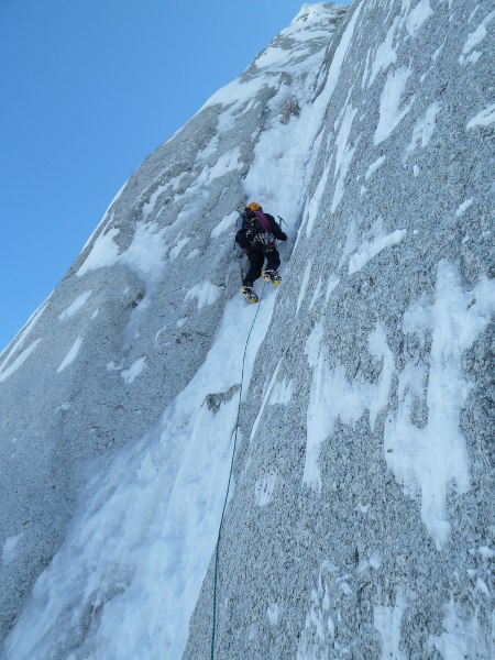 Los primeros metros se hacen duros, debido a las purgas de nieve que han borrado la traza. Aún así encontramos rápidamente el paso por el flanco izquierdo, unos 100 metros al ensamble, y me dispongo a montar la primera reunión. Los 2/3 primeros de pared los escalamos súperápido, terreno helado con pendientes de entre 60º y algún resalte a 70º. Hacia las 11 de la mañana estamos en el tercer nevero. A partir de aquí la cosa se vuelve más parada. Escalamos tres largos muy guapos de mixto, entretenidos, alrededor de M5, que nos conducen al último pilar de la pared. Aquí es donde ayer se embarcaron los colegas, así que decidimos tomar la segunda goulotte, más recta y evidente.