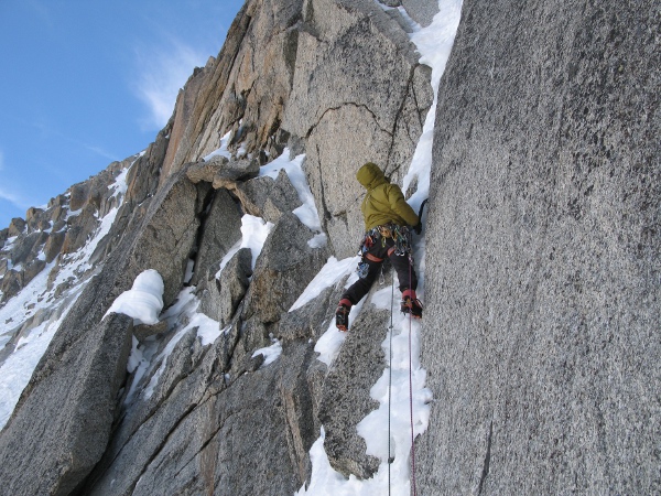 A continuación, cambiamos de escenario y nos trasladamos a las inmediaciones del teleférico Aiguille du Midi, mas conocido y transitado por su granito veraniego que por las goulottes invernales.