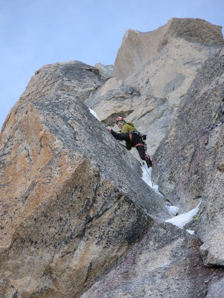 Finalmente nadie se ha aventurado y estamos solos en un recodo espectacular, inmersos dentro del macizo de Argentiére, rodeados de hielo, granito rojo y azotados por un viento helador que nos invade por todo el cuerpo en cada reunión. La temperatura rondará los -15ºC. Pero esto es parte de la magia del invierno.