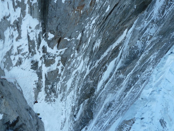 Para cuando se quieren dar cuenta les hemos adelantado a la entrada del corredor. Cruzamos la rigola por donde baja una cascada de nieve polvo y accedemos al gran colouir, 500 metros de corredor nos separan del gran escudo central. Mientras ascendemos la canal de acceso, vemos que hay una cordada vivaqueando en el extremo izquierdo de la diagonal, comentamos la jugada y seguimos sin parar hasta la primera reunión. La ruta está realmente seca y el viento que sopla en la parte alta tira pequeñas piedras que tenemos que ir esquivando.