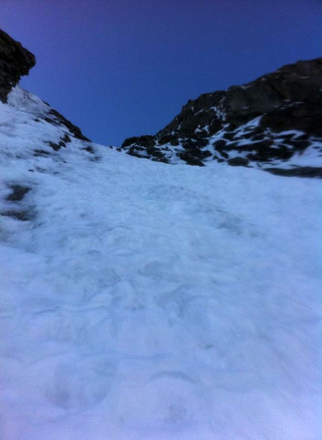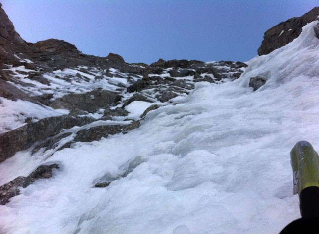 "Cargué con una cuerda de 8mm y 50m, algunos camalots, un par de pitones y 3 tornillos de hielo, y a las 3:50am partía de la cabaña Leschaux, escuchando música fuerte para animar la tediosa aproximación. 2 horas después llegaba a la base de la pared. Superé la rimaya con rapidez y adelanté a una cordada estadounidense que aparentemente querían escalar la eslovena y me preguntaron por la dirección correcta. Después de media hora adelanté a la única cordada que había en la pared. La tarde anterior en el refugio me habían dicho que me harían fotos, pero se habían desviado algo de la ruta correcta, y para cuando retomaron la vía yo ya había superado la panza que da acceso a la parte superior. Allí se encuentran las mayores dificultades, con secciones de hielo y mixto verticales.