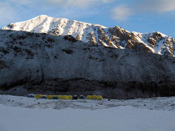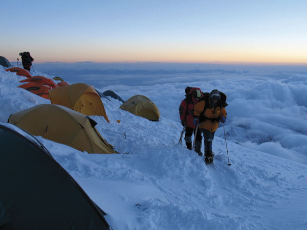 Con un ritmo, quizás demasiado fuerte (5 horas y media) hemos llegado al campo 2, a 5300 m. Este campo fue el escenario en 1991 de una de las mayores tragedias de montaña, cuando tras un seísmo quedó sepultado por una gran avalancha, muriendo cerca de cincuenta personas. Actualmente han trasladado el campo a un lugar mucho más seguro, pero también más incómodo en una inclinada ladera de hielo y piedras. Pero al fin estamos instalados, con comida para bastantes días y buen tiempo. Mientras derretimos nieve, vemos el atardecer y todo parece perfecto.