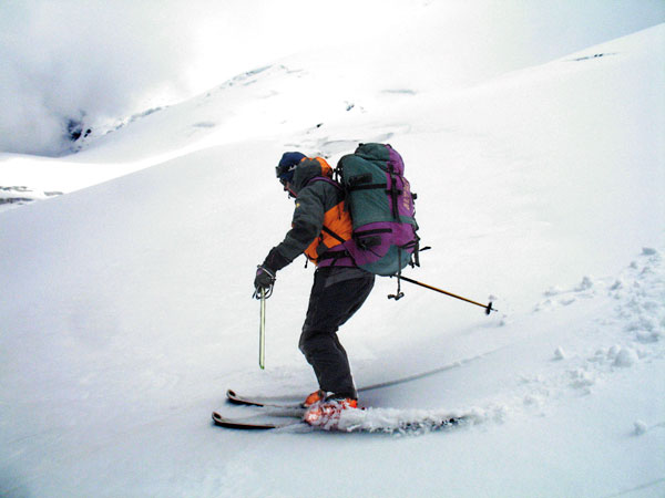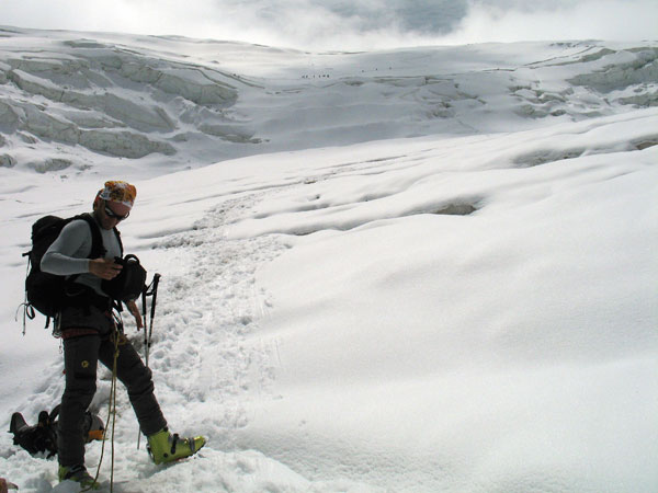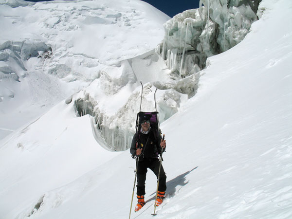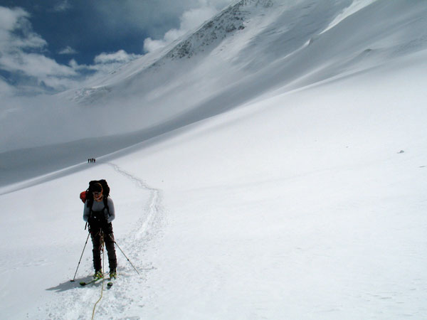 Solo y aburrido en este campo 2 observo el Razdelnaya, un pico de 6300 m que se encuentra sobre el emplazamiento del campo 3, muy cerca de éste. Mientras sigo aclimatándome a la altitud, decido ascender a él con los esquís. Alcanzo un amplio collado en donde algunos han preferido colocar su campo “2 y medio”, mucho más cómodo y menos saturado de gente, aunque eso sí, más expuesto al viento. Desde aquí la pendiente se empina hasta unos 40º, y por el momento mis pieles de foca van sujetándose en esta nieve entre polvo y costra. En los últimos metros decido dejar de resbalar y echo los esquís a la mochila. La ruta al campo 3 gira al este pero la cima está un poco más al oeste, así que allí me dirijo. He tardado sólo 3 horas, me encuentro fuerte y aún me queda lo mejor: la bajada hasta el campo 2.