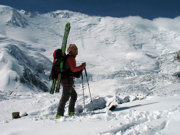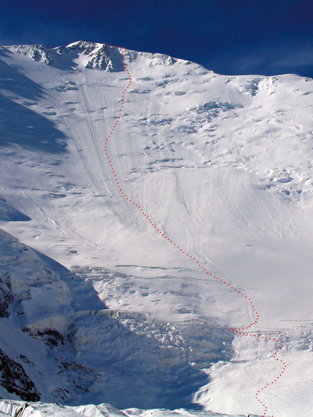 La entrada más directa a la cara norte es la que hizo el italiano Previtali, pero antes justo de la cima tenemos numerosas posibilidades para hacerlo también de forma bastante directa. Si se entra en la cara norte más abajo tenemos que hacerlo por alguno de los canales que hay entre los espolones rocosos y que son algo menos inclinados (40º), aunque después hay que trazar una diagonal hasta el centro de la cara norte, y la posibilidad de avalanchas es mayor. La primera parte de la ruta, es una ladera inclinada entre 45º y 50º, algo expuesta ya que hay resaltes y domos de nieve y de hielo entre los que la nieve es muy cambiante. Después de estos primeros 300 m, la ladera va perdiendo inclinación pasando a 40º y después a 35º. Es muy fácil perderse en esta cara norte tan amplia, así que hay que trazarse un eje de descenso seguro entre los seracs hasta la base. El resto es un descenso largo por amplias laderas en las que hay que estar atento a las grietas y a los seracs, muy pero que muy propenso a las avalanchas, que es sin duda el mayor peligro de la ruta. La zona final de grietas en la base de la cara norte es posible descenderla también, si hay nieve suficiente. Agencias y servicios