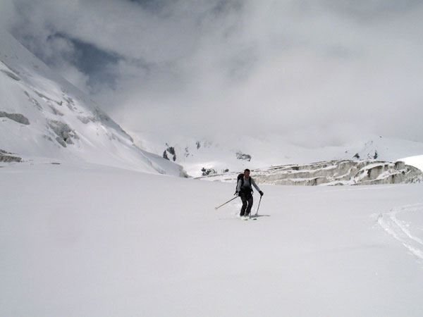 Intuyo que estoy entrando a la cara norte ya que la pendiente se va acentuando, aunque realmente no sé por dónde o si hay algo que me corta el paso. Empiezo a no verlo claro, pero debo resolver hacia abajo. La niebla abre lo suficiente para ver más allá una pendiente continua y asequible. Me dirijo a ella, pero debo pasar por encima de unos domos de nieve dura. Los cantos agarran en esta pendiente de unos 50º y sólo me queda atravesar una canalona entre las dos últimas jorobas. Me lanzo, y cuando llego a la canal se me empotran los esquís en nieve blanda y una fijación me salta. Como a cámara lenta siento que me desequilibro y caigo. Despacio al principio pero ganando velocidad súbitamente. No veo nada y no puedo respirar por la nieve que he tragado. Doy vueltas, no sé cuántas. Lucho por incorporarme sobre el único esquí puesto, y lo consigo. Me deslizo sobre él y me detengo.