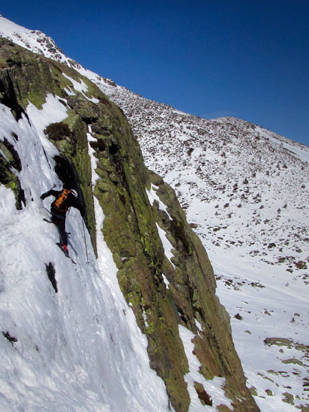 He perdido un bastón pero conservo los dos esquís ya que el suelto lo llevo atado por la correa. Afortunadamente he llegado a esa zona a la que me dirigía, menos empinada y continua, que supongo está cerca del espolón que baja de la cima. Debo seguir bajando y lo hago. Procuro enlazar virajes hasta que el aliento me falta y paro a buscar referencias.