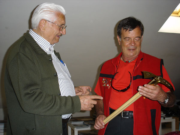 José Barrabés hace entrega en Benasque, en 2008, de un simbólico piolet de oro al doctor Morandeira por los servicios prestados a montañeros y montañeses a lo largo de su vida