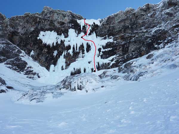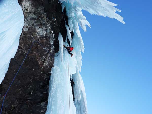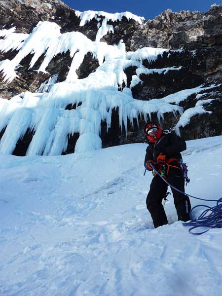 Después de 300 metros de corredor, empiezan las dificultades: un largo de WI 5 sobre divertidas coliflores y con hielo extremadamente frágil (había que echarle ganas para no desmoralizarse escuchando el tenebroso ruido de las coliflores crujiendo) nos deja al pie del impresionante largo donde toneladas de hielo colgaban por encima de nuestras cabezas de forma desordenada.