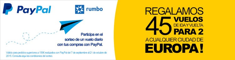 La promoción de Barrabes, en colaboración con PayPal y Rumbo, consiste en el sorteo diario de 1 billete de avión para doble o para 2 personas y de ida y vuelta para visitar cualquier ciudad de Europa (los destinos están sujetos a la disponibilidad de Rumbo), entre los pedidos superiores a 150€ realizados con PayPal en www.barrabes.com, del 7 de septiembre al 21 de octubre de 2015 (45 sorteos).