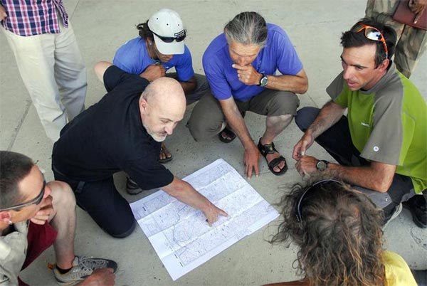 Reunión técnica en Skardu antes de montar en el helicóptero para ir al campo base. De izquierda a derecha: Jonatan Larrañaga, Sebastián Álvaro, Jordi Tossas, Jordi Corominas, Dani Ascaso (de espaldas) y un miembro del grupo estadounidense