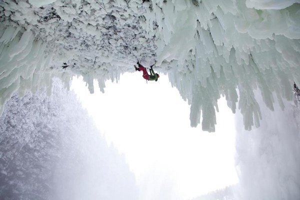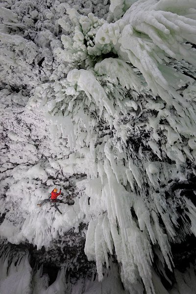 La vía es como poco peculiar: una especie de pared salpicada de agua helada (de ahí el nombre), con un hielo de tipo Ben Nevis pero con una particularidad: -45º de inclinación y hielo de cascada. La ascendieron en artificial para instalar los bolts necesarios para asegurarse, y posteriormente la subieron con movimientos de hielo en su totalidad, nada de dry-tooling