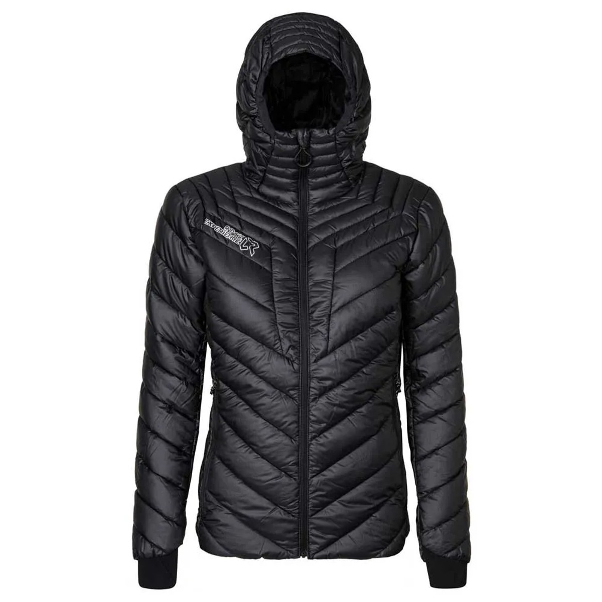 El tejido exterior de poli ripstop reciclado con tratamiento hidrofugo aporta resistencia a la abrasión y permite que el agua y la humedad se deslicen, protegiendo el acolchado interior. Los puños de lycra doble proporcionan un ajuste cómodo y seguro, mientras que la capucha y el bajo, también con lycra, se adaptan al cuerpo.