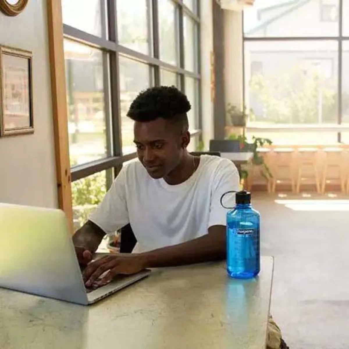 Láhev Nalgene SUSTAIN s úzkým hrdlem, objem 1 litr. Vyrobeno z 50% recyklovaného plastu, bez BPA/BPS, odolné a vhodné do myčky.