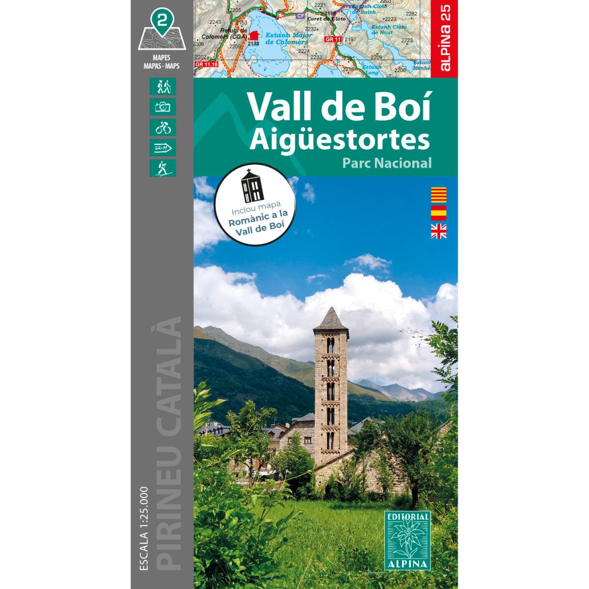 Neue Karte des Boí-Tals, einem wahren Schatz der Pyrenäen, wo die wildeste Natur und die tausendjährige Geschichte in perfekter Harmonie zusammenkommen. Umgeben von imposanten Gipfeln wie dem Comaloforno und dem Besibris und übersät mit Gletscherseen, ist das Tal die ideale Kulisse für Wanderungen und Abenteuer im Nationalpark Aigüestortes. Als Neuheit enthält diese Ausgabe eine exklusive Karte, die der Romanik gewidmet ist, mit allen Informationen, um die Kirchen zu entdecken, die von der UNESCO zum Weltkulturerbe erklärt wurden.