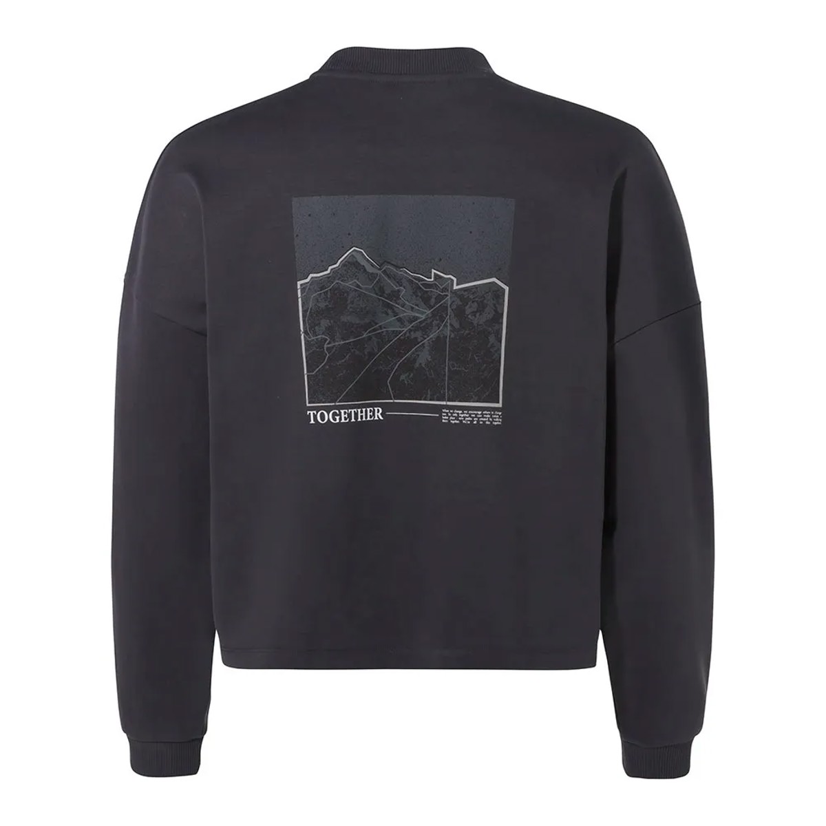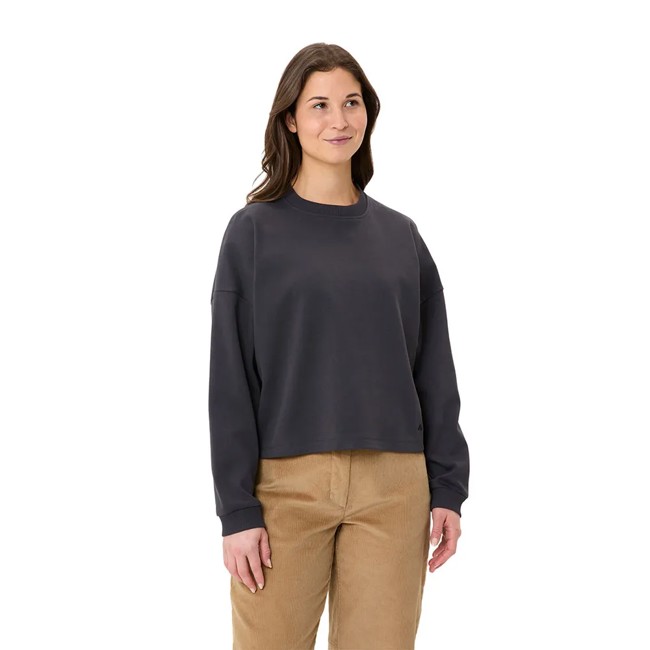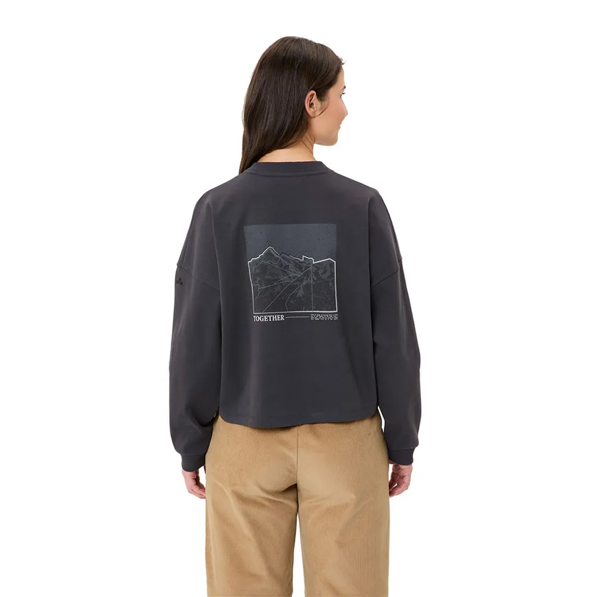 Lässiges Langarm-T-Shirt für Damen, mit Rundhalsausschnitt, modernem Schnitt und einem Print auf der Rückseite. Hergestellt aus GOTS-zertifizierter Bio-Baumwolle.