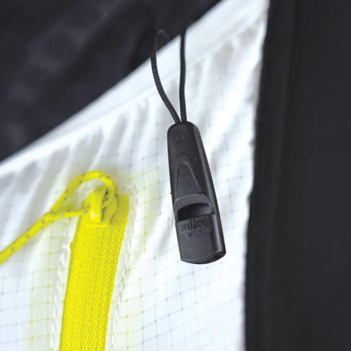 - Small keychain with carabiner and whistle in the right elastic pocket on the front of the bag