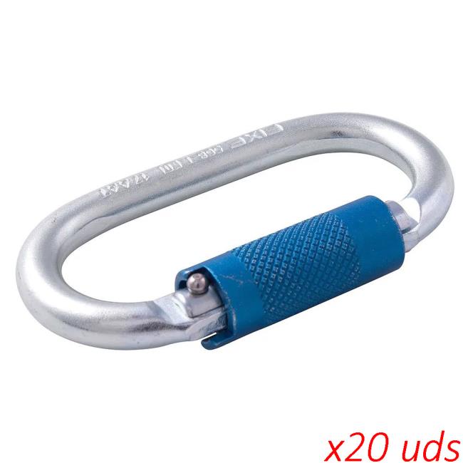 Pack de 20 unidades Mosquetón en acero de alta resistencia. Ideal para labores de rescate, industria y trabajos en altura. Práctico para uso con poleas y nudos. Cuenta con cierre automático.