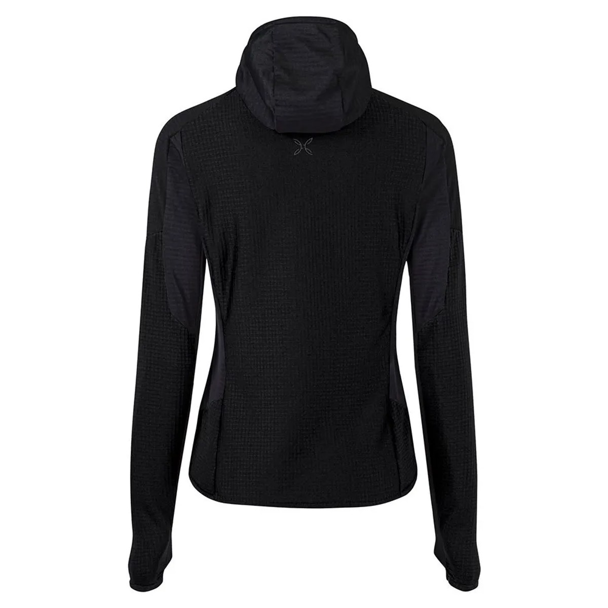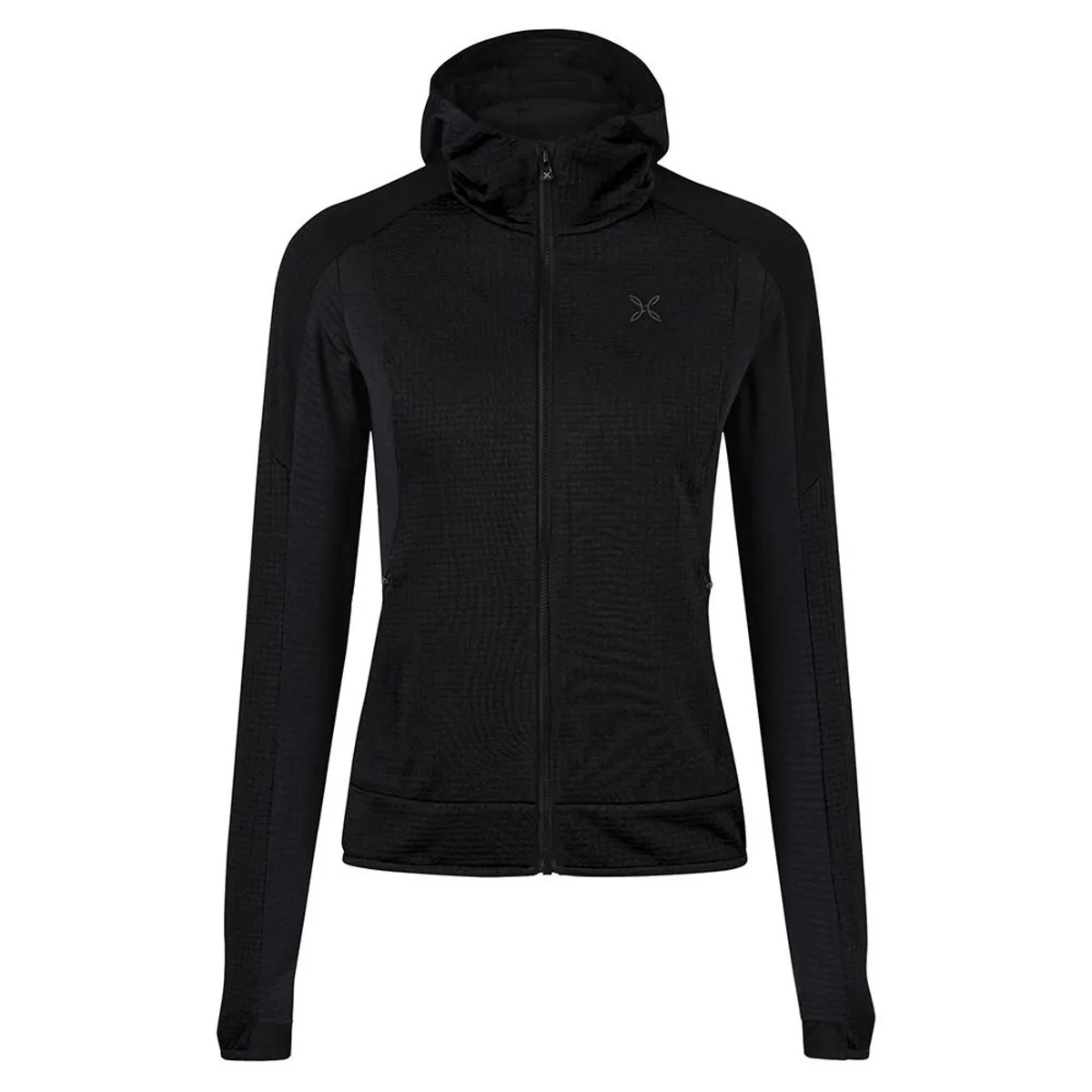 Forro polar térmico elástico para mujer, ideal para montañismo y actividades al aire libre. Protección UV, capucha, puños con orificios para los pulgares y bolsillos con cremallera.