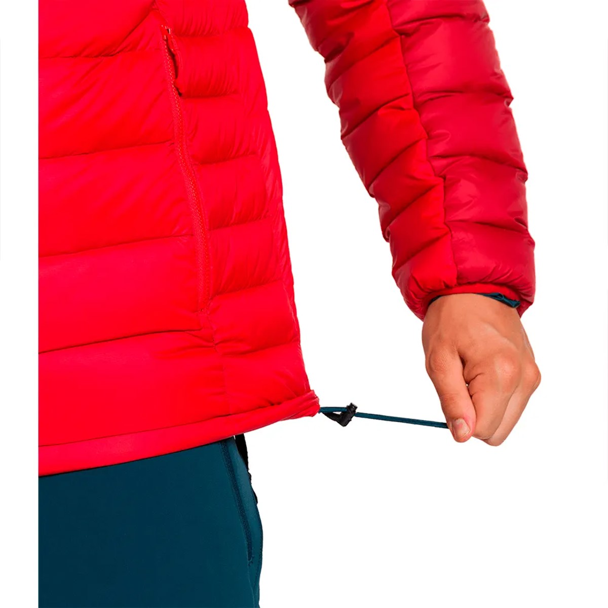 Hőszigetelő kabát, könnyű és összenyomható, újrahasznosított pehellyel, ideális hegyi tevékenységekhez. Rögzített kapucnival, húzózsinórral, több zsebbel és PFC-mentes vízlepergető anyaggal.