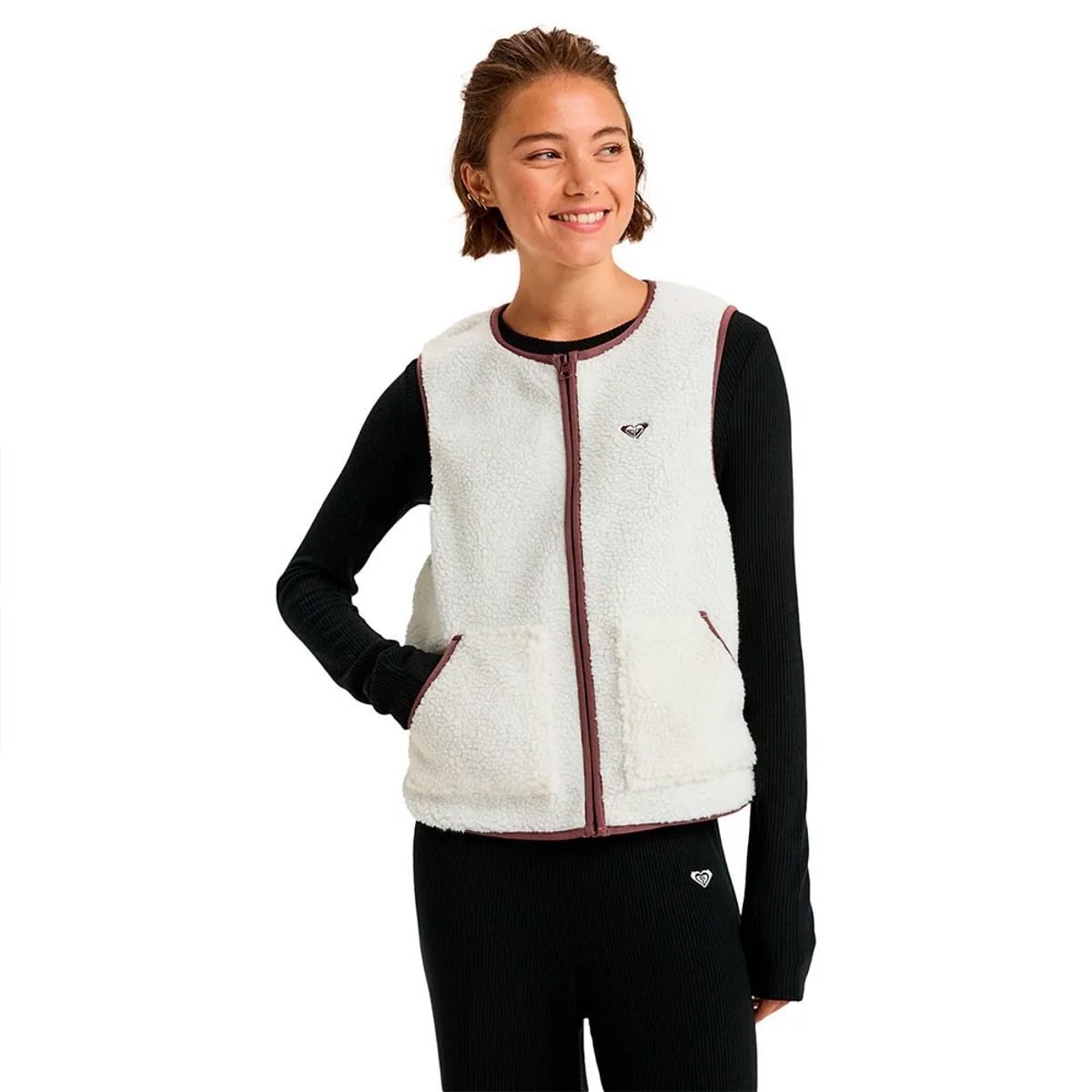 Gilet sportivo femminile progettato per offrire calore e comfort. È realizzato in tessuto sherpa, che offre un tocco morbido e piacevole, ideale per le giornate più fredde. La sua vestibilità regolare è accompagnata da una chiusura completa con zip e un ampio colletto per una maggiore protezione.