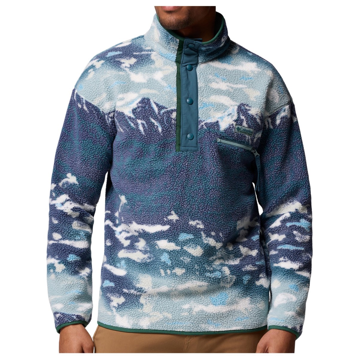 "Columbia" "Helvetia II Printed Half Snap" vilna puikiai tinka nuotykiams gamtoje ir kalnuose. Jo kvėpuojantis ir greitai džiūstantis audinys užtikrins komfortą jūsų veiklos metu. Aukšta apykaklė maloniai apsaugo nuo šalčio kaklo ir pakaušio srityje.