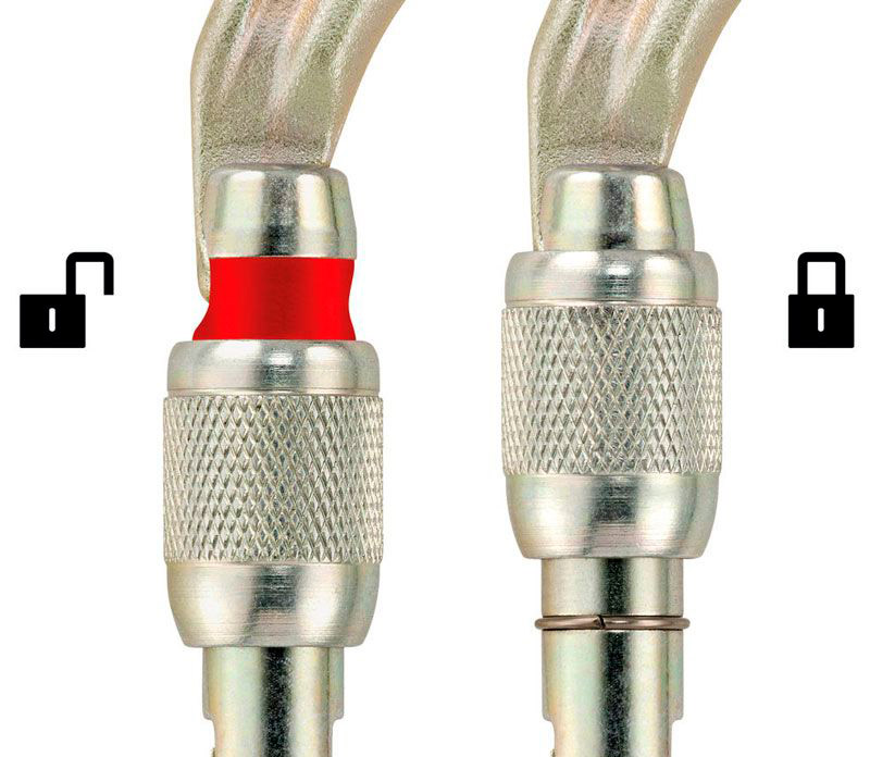 - Indicador rojo visible cuando el mosquetón no está bloqueado.