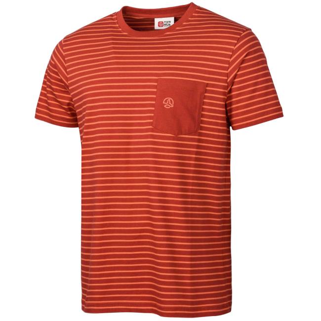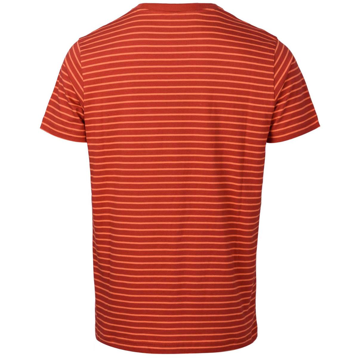 T-shirt de manga curta às riscas 100% em algodão orgânico, livre de pesticidas e herbicidas. Incorpora um bolso frontal no peito.