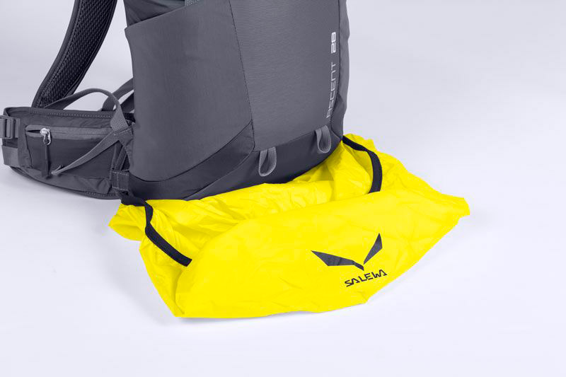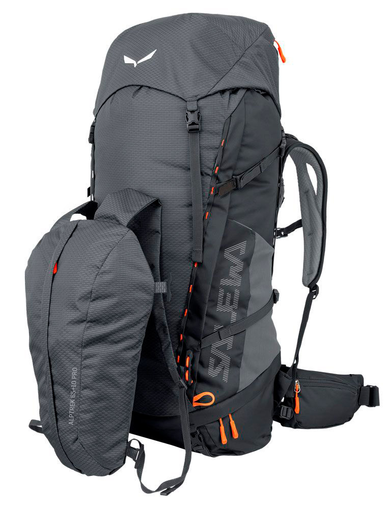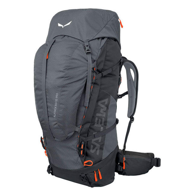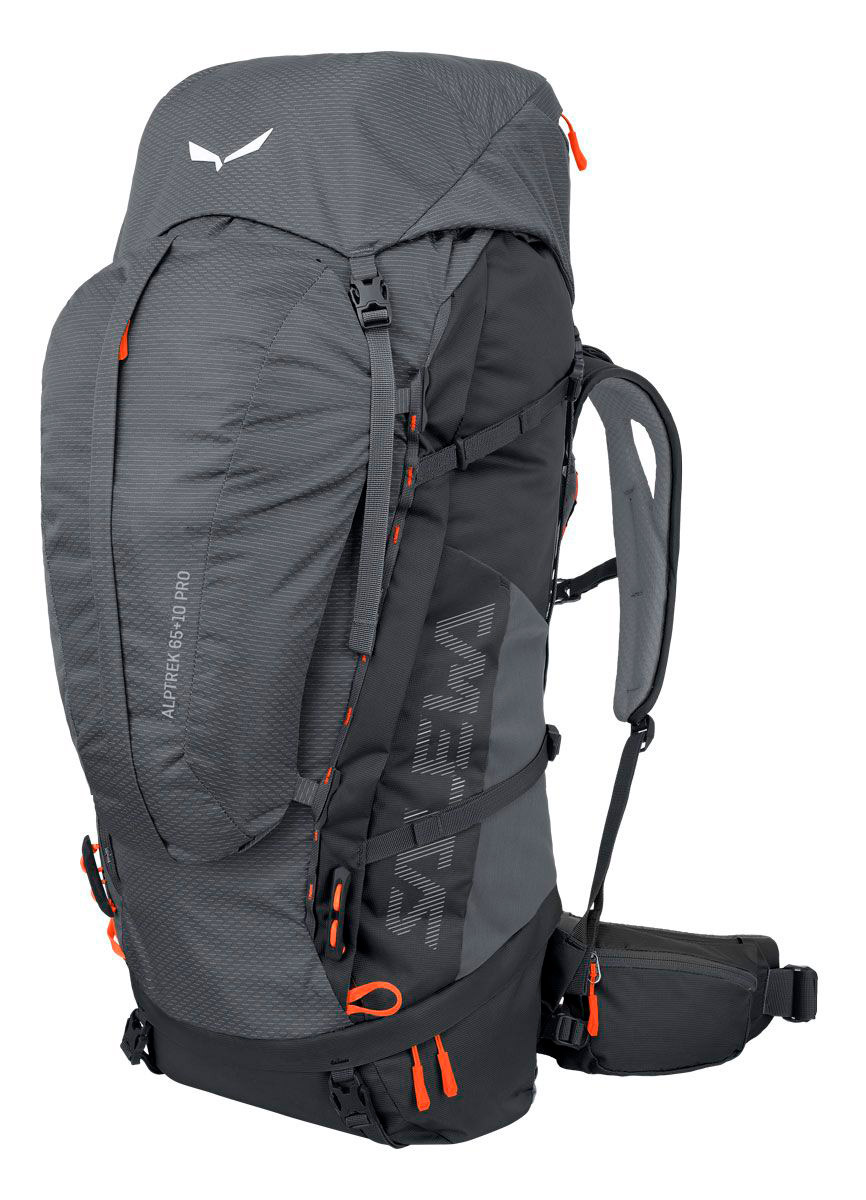 Mochila de trekking de la marca Salewa con capacidad de 65 litros ampliables a 10 más si la carga lo requiere.