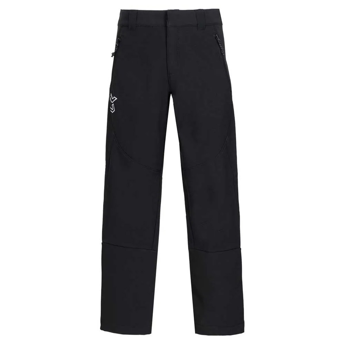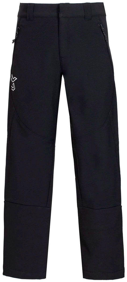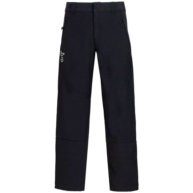 Zimske hlače za treking in pohodništvo za otroke. Iz elastične tkanine Softshell. Pas je odprt z elastiko ob straneh in hrbtnem delu. Ima žepe z zadrgo in odprtine z vstavki na spodnjem delu nog, zadrge in odstranljive gamaše.