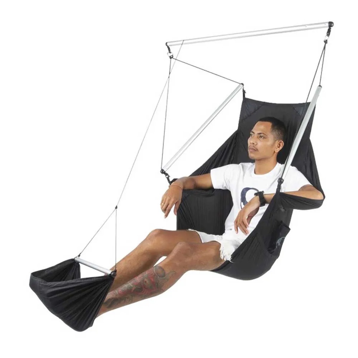 Enostaven za namestitev z eno samo sidrno točko, Moonchair je izdelan iz visokokakovostnega padalskega najlona, ki zagotavlja moč, udobje in lahkotnost. Tkanina je zračna in ima certifikat Oeko-Tex® Standard 100, zaradi česar je primerna za alergike ali občutljivo kožo.
