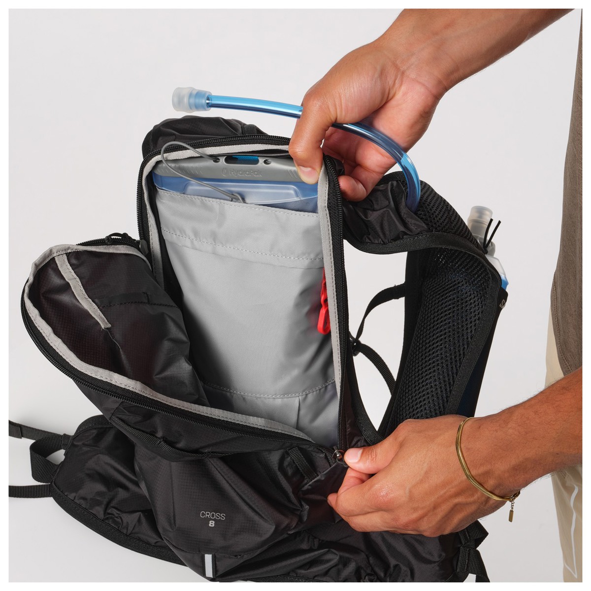 CROSS 8:s transportsystem sitter bekvämt och säkert på kroppen, vilket ger stor rörelsefrihet. De två flaskhållarna på axelremmarna underlättar tillgången till hydrering, och den är också kompatibel med vätskesystem. Dess breda huvudöppning gör det enkelt att organisera och komma åt innehåll.